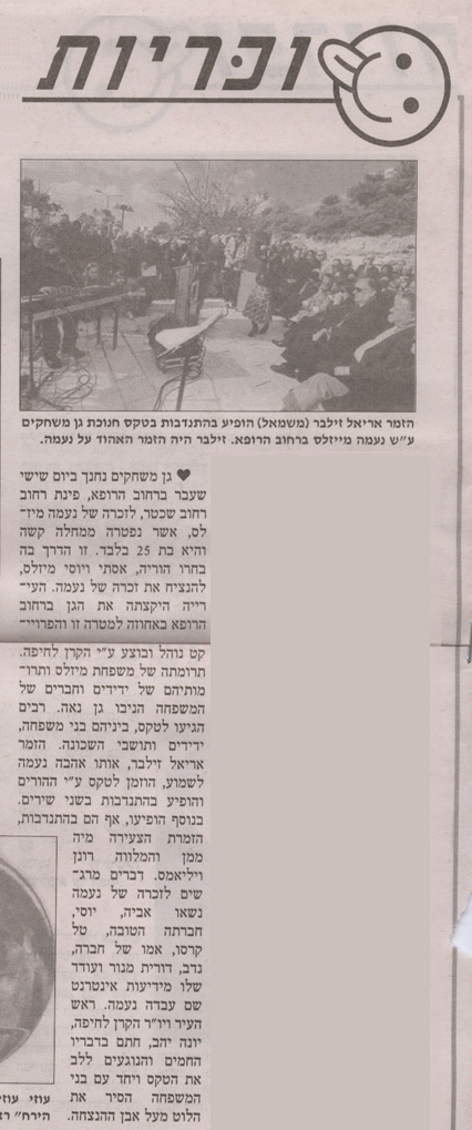 סיפורה של נעמה | פרידה מנעמה | כתבת הפרידה | תולדות המחלה | כותבים לנעמה | נעמה כותבת | אלבום תמונות | סרט וידאו | זוכרים את נעמה | כיתבו לנו | גן נעמה עיצוב: איריס משלי-גרעין